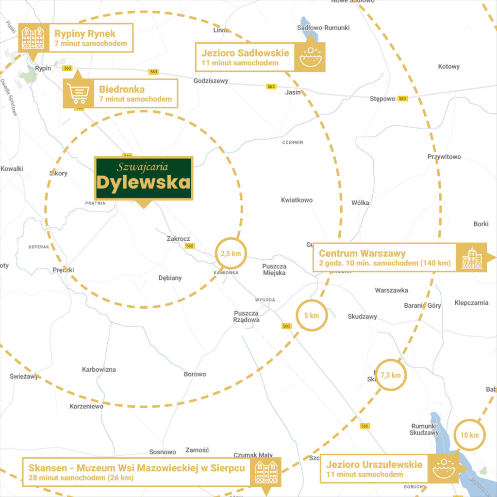 Choć Szwajcaria Dylewska oferuje spokój i bliskość natury, to jednocześnie umożliwia szybki dostęp do infrastruktury miejskiej. Zaledwie 10 minut dzieli Cię od centrum Rypina, gdzie znajdziesz sklepy, usługi, szkoły, siłownie, restauracje i wiele innych udogodnień. Bliskość Sierpca, Włocławka, Torunia oraz szybki dojazd do Warszawy sprawiają, że ta lokalizacja jest idealna dla osób ceniących równowagę między naturą a miastem.